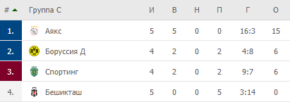 Нідерландський «Аякс» виграв на виїзді у «Бешикташа» (2:1) і набрав 15 очок із 15 можливих. Дубль оформив Себастьян Алле, у якого стало 9 забитих м'ячів, як і у Роберта Левандовськи з «Баварії».