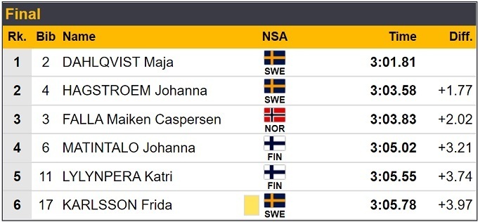 У жінок подвійну перемогу здобула збірна Швеції. Першою фінішувала Майя Дальквіст, а другою – Йоханна Хагстрьом.