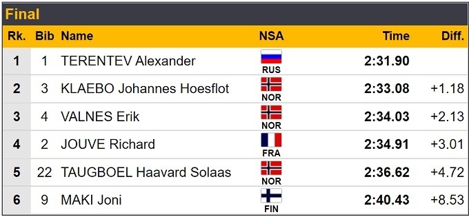 Сьогодні класичними спринтами у фінській Руці стартував новий сезон Кубка світу з лижних гонок. У чоловіків свою першу в кар'єрі перемогу на Кубку світу здобув 22-річний росіянин Олександр Терентьєв. У фіналі він сенсаційно обіграв норвежців Йоганнеса Клебо та Еріка Вальнеша.