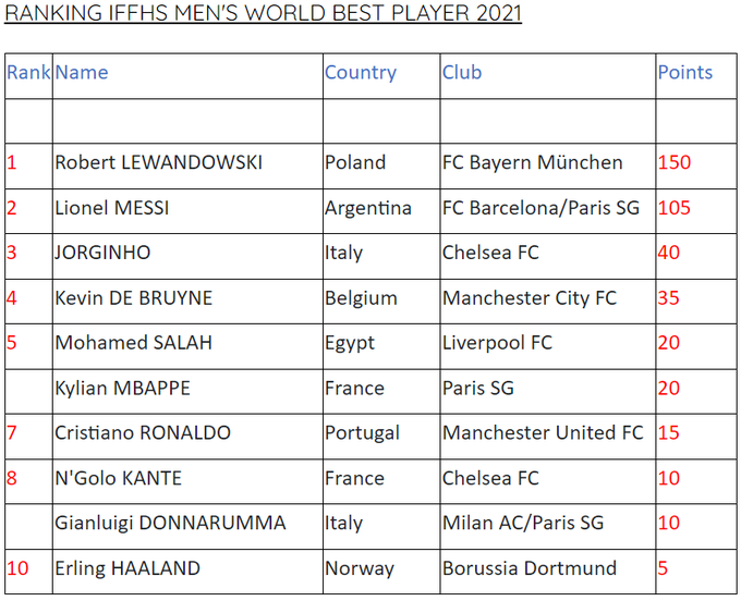 Міжнародна федерація футбольної історії та статистики (IFFHS) назвала Роберта Левандовськи найкращим гравцем світу 2021 року.
