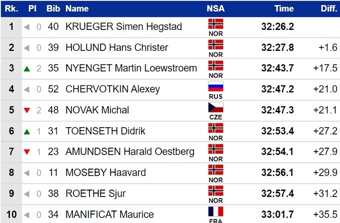 У топ-10 потрапив лише один представник збірної Росії - Олексій Червоткін, який став четвертим. Лідер команди Олександр Большунов показав лише 14-й результат.