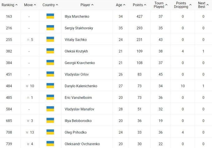 Щодо українців, то Віталій піднявся на 5 позицій, Данило Каленіченко опустився на 10. Ілля Марченко та Сергій Стаховський залишилися при своїх. Також один рядок додав Ерік Ваншельбойм.