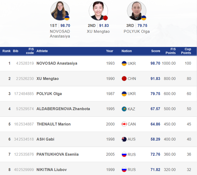 Вперше в історії КС одразу дві українські фрістайлістки піднялися на п'єдестал. У лижній акробатиці Анастасія Новосад виборола золото, а Ольга Полюк – бронзу.