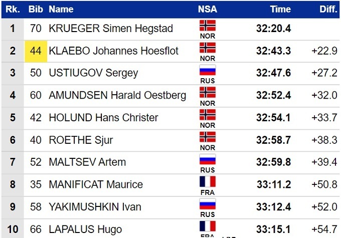 Для Крюгера це друга поспіль перемога в коньковій розділці - тиждень тому він виграв гонку в Ліллехаммері.