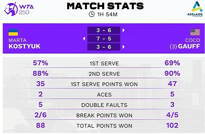 Марта Костюк (Україна) – Корі Гауфф (США) – 3:6, 7:5, 3:6