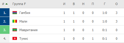 Після першого туру Гамбія та Малі набрали по 3 очки у групі F, а у Мавританії та Тунісу поки що немає залікових пунктів.