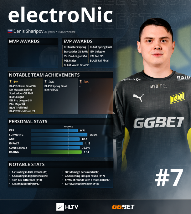 Учасник складу Natus Vincere з CS:GO Денис electronic Шаріпов посів сьоме місце у списку найкращих гравців 2021 року за версією порталу HLTV.org. Рейтинг кіберспортсмена за підсумками сезону становив 1,14.