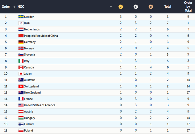 У топ-3 також входять команди ROC (2–3–2) та Нідерландів (2–2–1). Цікаво, що Норвегія тепер лише на 6-й позиції (2–0–2).