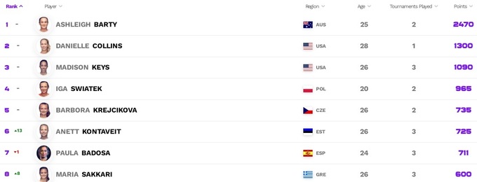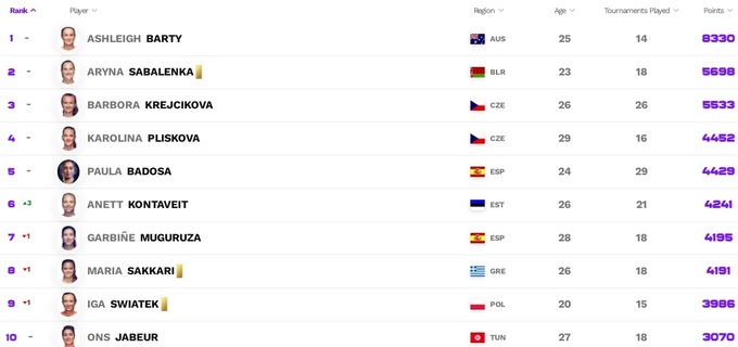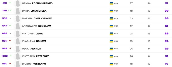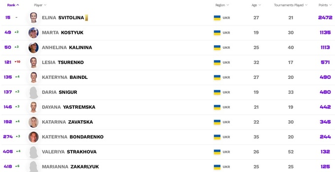 Щодо українок, то Еліна Світоліна зберегла своє місце, Марта Костюк додала два рядки, встановивши особистий рекорд. Також повернулася до топ-50 і Ангеліна Калініна. Леся Цуренко опустилася на 10 позицій, решта має невеликий прогрес. Дар'я Снігур оновила своє найкраще досягнення у світовій класифікації.