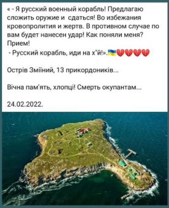 «Російський корабель запропонував гарнізону острова Зміїний здатися. Був посланий на… Далі розпочався ракетно-артилерійський удар. 13 українських прикордонників загинули. Вічна слава Героям! Ганьба і смерть російським окупантам!».