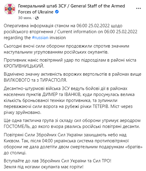01:50. Генеральний штаб ЗСУ: «Шановні співгромадяни - жителі Сумської, Чернігівської, Херсонської, Житомирської, Київської, Харківської областей! Вірогідно, вночі рашисти будуть підтягувати свої війська з паливом і боєприпасами. Передавайте інформацію про пересування ворожої техніки українським військовим або керівництву своїх населених пунктів, районів, областей! Тільки разом переможемо!»