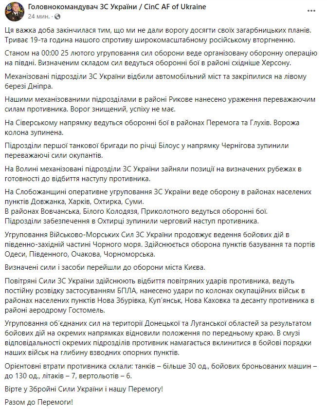 00:47. Головнокомандувач ЗС України генерал-лейтенант Валерій Залужний підбив підсумки першого дня війни.
