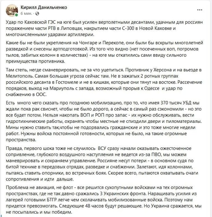 03:10. Олексій Арестович видав аналіз на поточний момент: