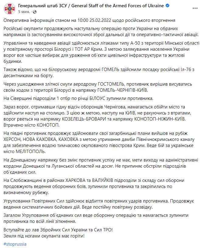 03:35. Генеральний штаб ЗСУ: «Шановні співгромадяни – жителі Сумської, Чернігівської, Херсонської, Житомирської, Київської, Харківської областей! Вірогідно вночі рашисти будуть підтягувати свої війська з паливом і боєприпасами.