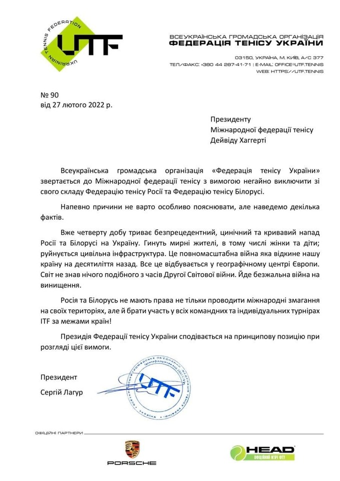 Федерація тенісу України (ФТУ) звернулася до президента Міжнародної федерації тенісу (ITF) Девіда Хаггерті з вимогою негайно виключити з-поміж членів організації Федерації тенісу Росії та Білорусії. Заяву підписав голова ФТУ Сергій Лагур.