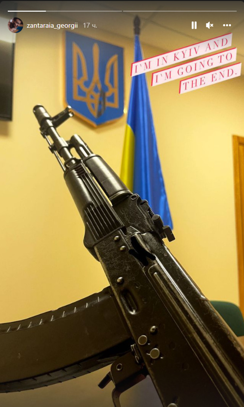 «Я в Києві і стоятиму до кінця», - написав Зантарая в Instagram, показавши автомат на тлі прапора та герба України.
