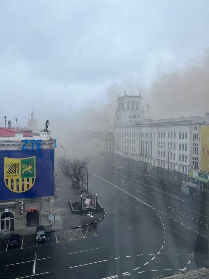 Заступник голови Харківської ОДА Роман Семенуха у Facebook: «Щойно, Харків, пряме влучання крилатою ракетою у будівлю міськради».
