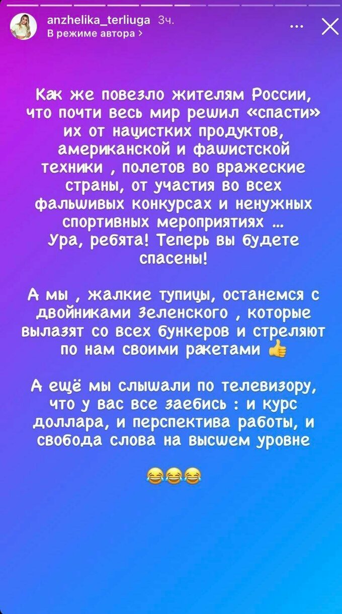 А ми жалюгідні тупиці, залишимося двійниками Зеленського, які вилазять з усіх бункерів і стріляють своїми ракетами. А ще ми чули по телевізору, що у вас все за*бісь і курс долара і перспектива роботи і свобода слова на найвищому рівні», - написала Терлюга.