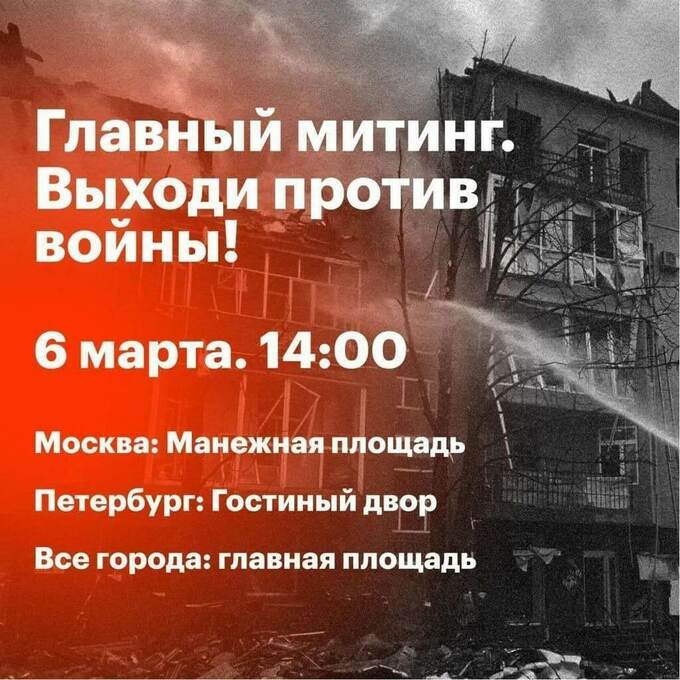 Команда російського опозиційного політика Алексея Навального закликала росіян вийти 6 березня по всій країні на мітинг проти війни. Початок – о 14:00 на головних площах російських міст.
