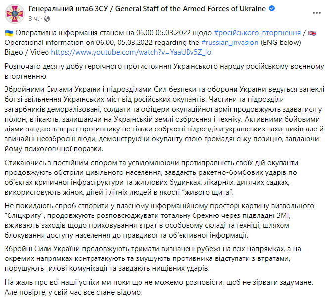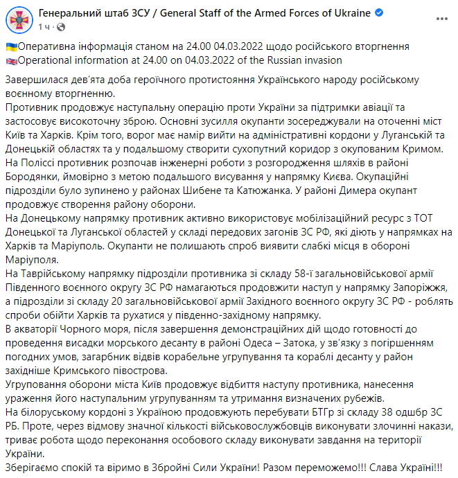 02:00. Зведення Генштабу ЗСУ на початок 10-го дня війни. Ворог хоче створити сухопутний коридор