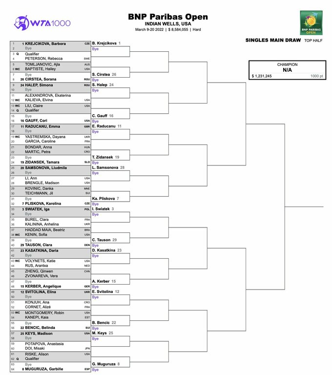 Еліна Світоліна (№18 WTA) перше коло пропускає через високий номер посіву і у другому зіграє з переможницею зустрічі Ана Конюх – Алізе Корне.