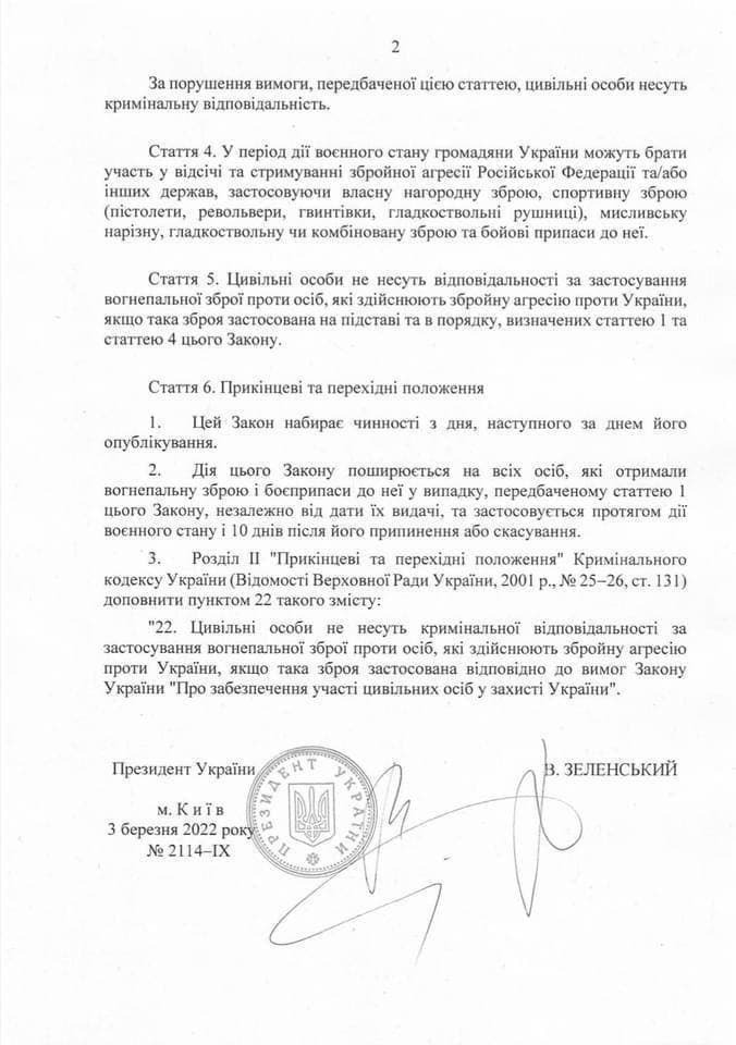 Громадянам України та іноземцям, які перебувають на її території, офіційно дозволили ліквідувати російських загарбників у будь-який спосіб, у тому числі і за допомогою особистої зброї.