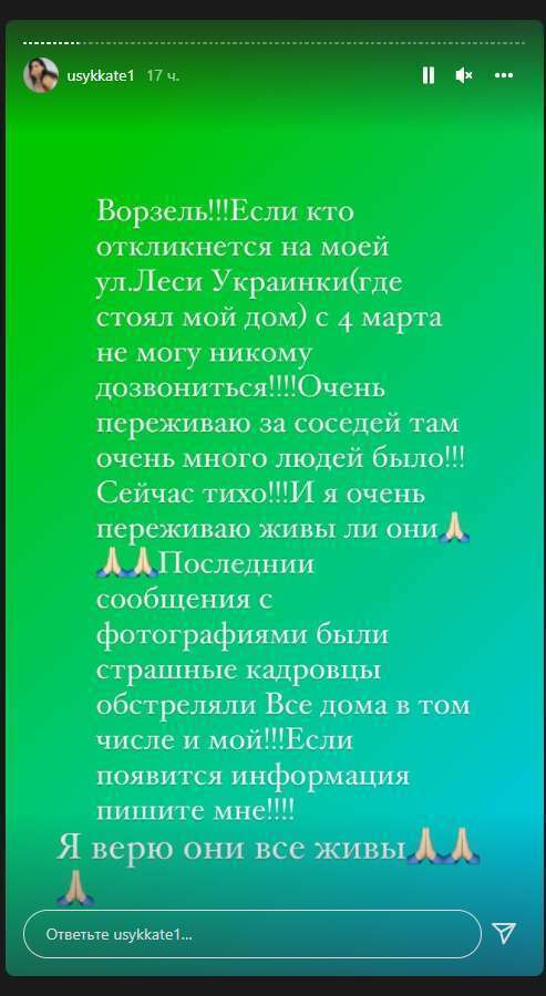 «Якщо хтось відгукнеться з моєї вулиці Лесі Українки, де стояв мій будинок. Із 4 березня не можу нікому додзвонитися. Дуже переживаю за сусідів. Там було дуже багато людей. Зараз тихо, і я переживаю, чи вони живі.