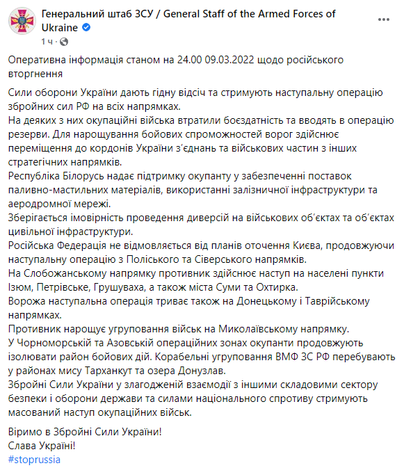 Підсумки 14-го дня війни, 9 березня