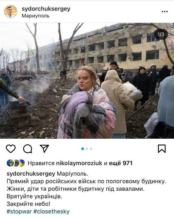 «Маріуполь. Прямий удар російських військ по пологовому будинку. Жінки, діти та робочі будинки під завалами. Врятуйте українців. Закрийте небо», – написав Сидорчук.