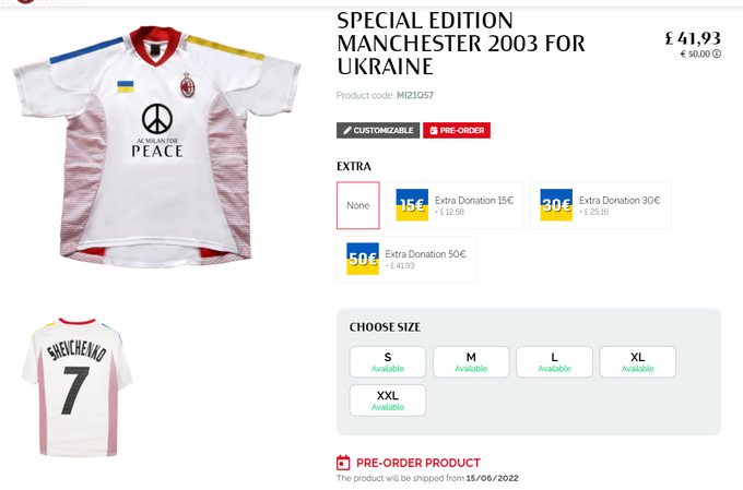 На ній зображені елементи українського прапора, а замість логотипу спонсора – напис «Мілан» за мир». Вартість футболки – 50 євро.