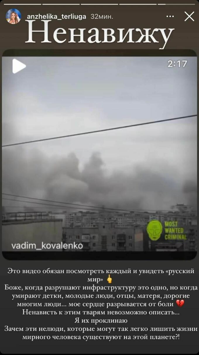 Відома українська каратистка Анжеліка Терлюга у себе в Інстаграмі жорстко висловилася про бомбардування, яке здійснюють рашисти на території України.