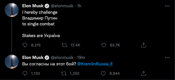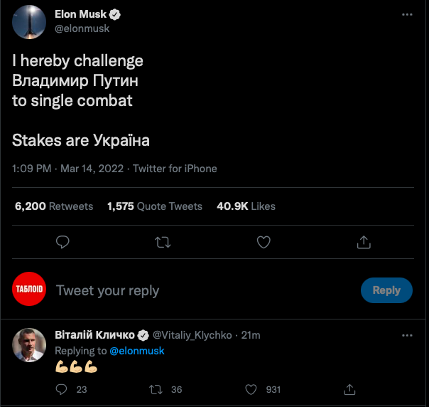 «Ви згодні на цей бій?», - запитав Ілон у офіційного акаунту кремля, але ті поки мовчать.