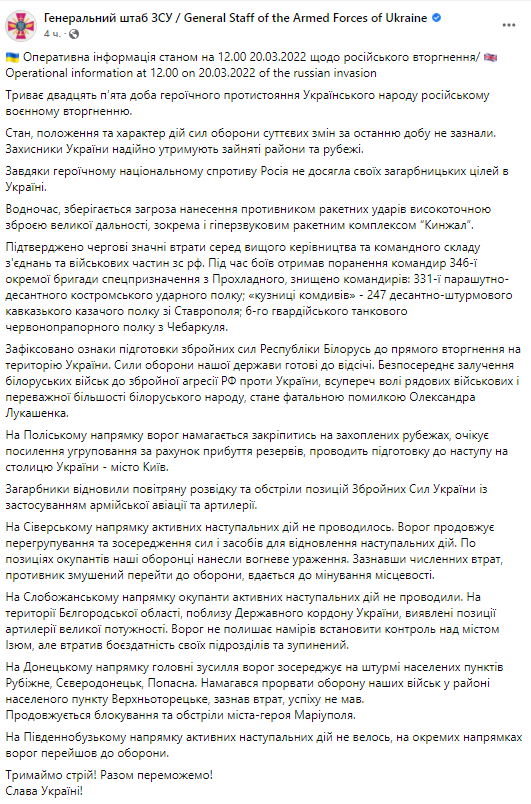 Генштаб ЗСУ: «Загроза наступу з Республіки Білорусь на волинському напрямку оцінюється як висока. Сили оборони України готові до відсічі. Упродовж найближчих 1–2 днів Білорусь вступить у війну з Україною на боці Росії. Незважаючи на опір з боку рядових військових та жителів Білорусі, рішення ухвалене керівництвом країни».