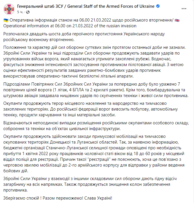 26-й день війни. 21 березня. Президент рф владімір путін продовжує вести агресивну війну в Україні. У зв'язку із військовою агресією Sport.ua перейшов на спеціальний режим роботи. Сайт висвітлює всі події, що відбуваються в Україні.