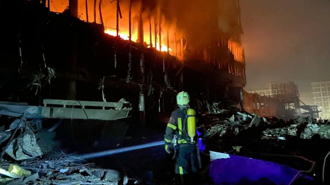 У Подільському районі Києва пролунали вибухи. Рятувальники повідомили про 8 загиблих на місці події. На місці влучання снаряда в один із торгових центрів у Подільському районі Києва всю ніч працювали рятувальники та медики.