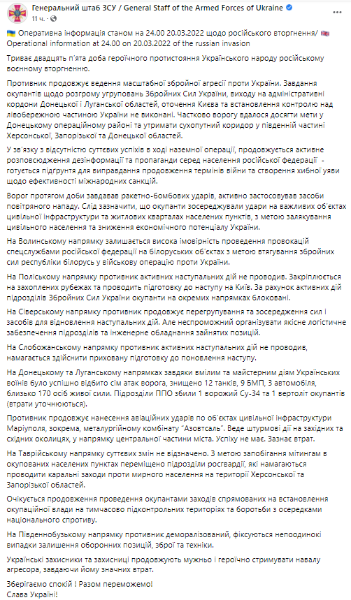 «Білорусь – земля партизанів. Наші герої зупиняють російські потяги, псують російську техніку, роздають листівки, аби не допустити білоруських військ до України. Україна переможе, Білорусь також буде звільнена».