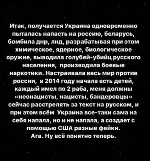 Налаштовувала весь світ проти Росії, у 2014 році розпочала їсти дітей, кожен мав по два раби. Мене повинні «неонацисти, нацисти, бандерівці» зараз розстріляти за текст російською, і при цьому Україна все-таки сама на себе напала, але й не напала, а створює за допомогою США різні фейки. Ага. Ну, все тепер зрозуміло».