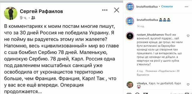 «Який же смердючий, вусатий під**ас... Нехай розповість краще, де гроші, які мали бути виплачені за єврокубки команді, коли ця істота там працювала. І це випадковість, що гроші до команди не дійшли, а квартири на росії цього х*йла з'явилися», - написав Рустам Худжамов.