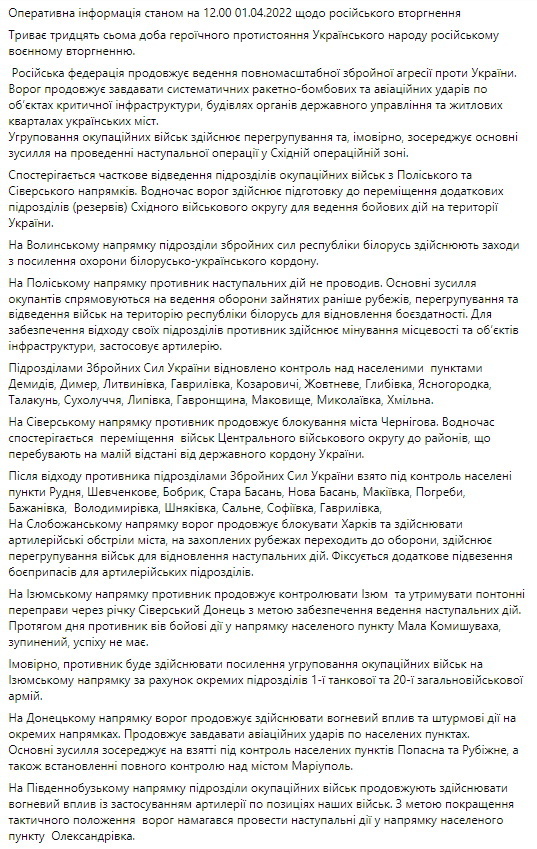 Українська армія за добу відбила 7 ворожих атак на Донецькому та Луганському напрямках, також продовжується часткове відведення підрозділів російських окупаційних військ з півночі Київської області у бік Білорусі.