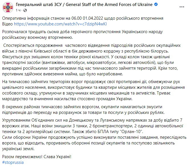 Генштаб ЗСУ: «Спостерігається продовження часткового відведення підрозділів російських окупаційних військ з півночі Київської області у бік державного кордону з Республікою Білорусь.