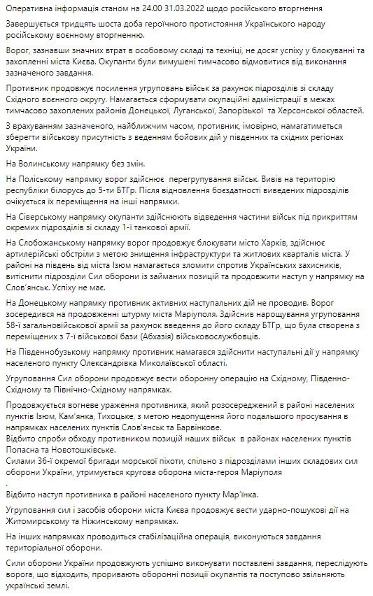 Генштаб ЗСУ: «Ворог, зазнавши значних втрат в особовому складі та техніці, не досяг успіху в блокуванні та захопленні міста Києва. Окупанти змушені були тимчасово відмовитися від виконання зазначеного завдання».