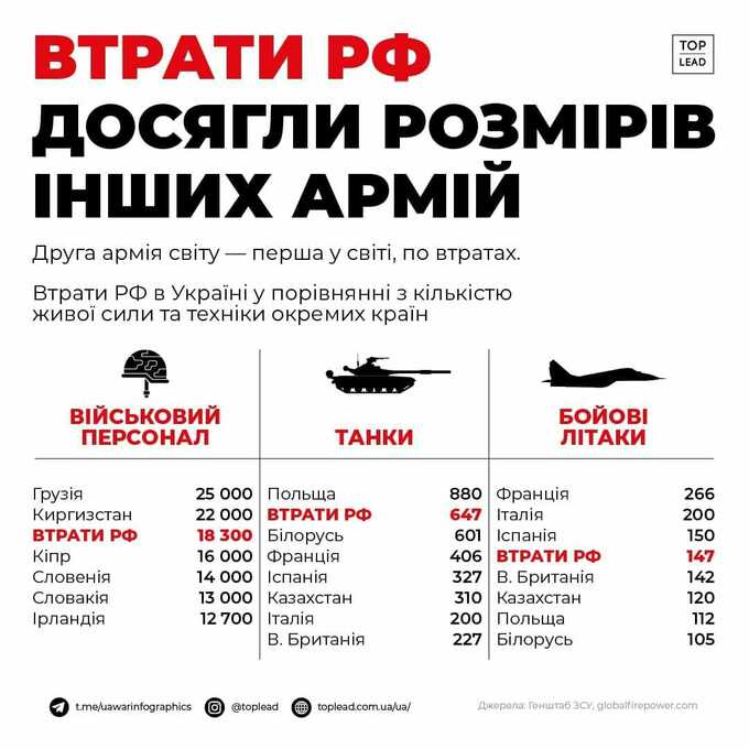 ФОТО. Втрати Росії у солдатах та танках досягли розмірів багатьох армій