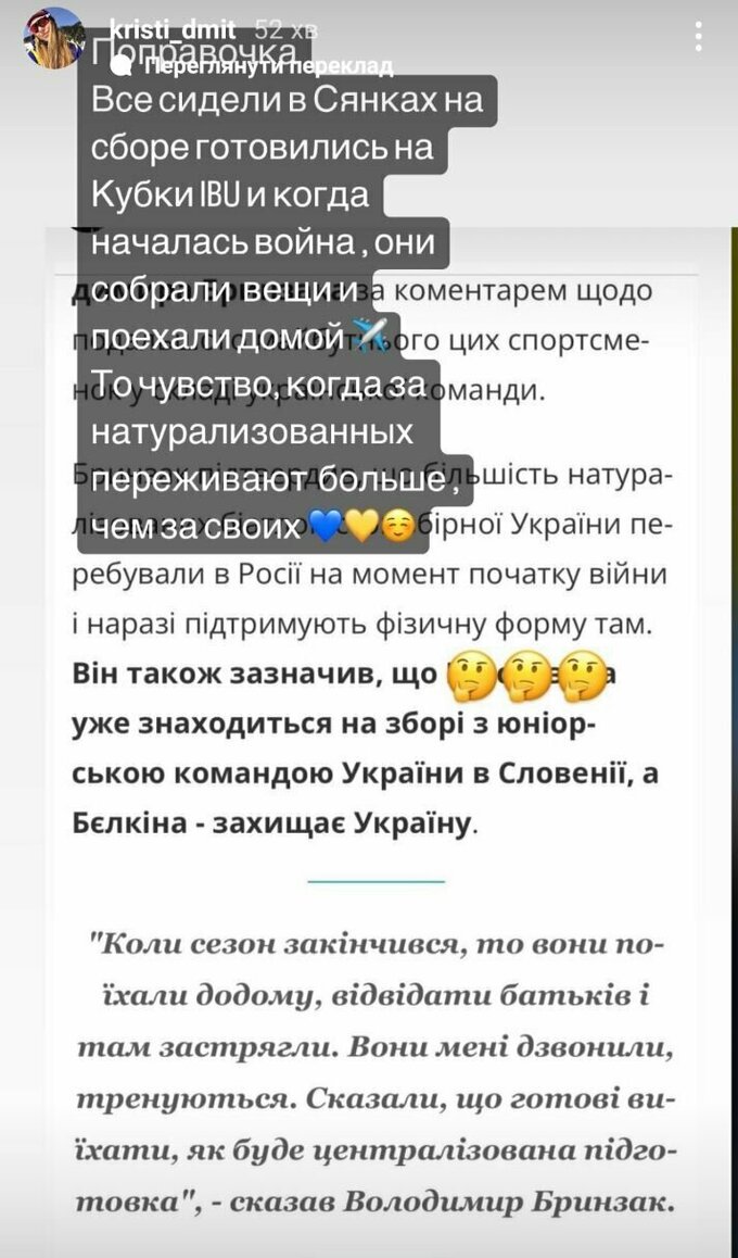 «Поправочка. Усі сиділи у Сянках на зборі, готувалися на Кубок IBU і коли почалася війна, вони зібрали речі та поїхали додому. Те відчуття, коли за натуралізованих переживають більше, ніж за своїх.