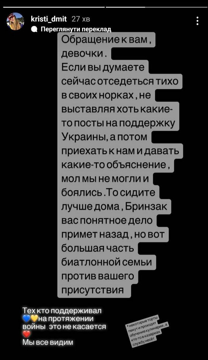Звертання до вас, дівчата. Якщо ви думаєте зараз відсидітися тихо у своїх норах, не виставляючи хоч якісь пости на підтримку України, а потім приїхати до нас і давати якісь пояснення, мовляв, ми не могли і боялися, то сидіть краще вдома. Бринзак вас, зрозуміло, прийме назад, але ось більшість біатлонної сім'ї проти вашої присутності.