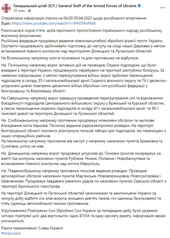 Спікер командування Повітряних сил ЗСУ Юрій Ігнат: «8 квітня зенітні ракетні війська знищили три повітряні цілі: крилату ракету, БпЛА та один гелікоптер. Крім того, є інформація Операції Об'єднаних сил щодо знищення ще одного гелікоптера рашистів.
