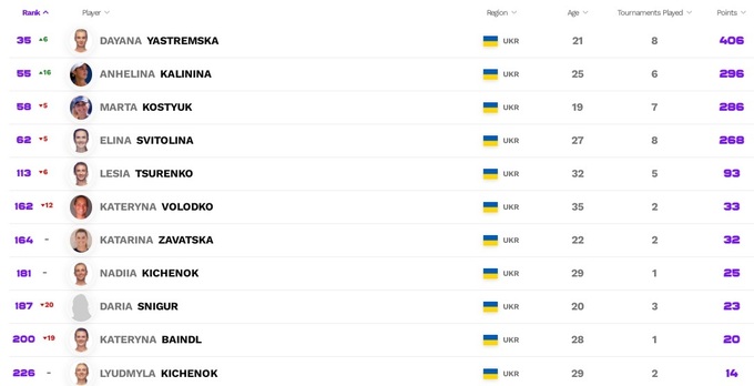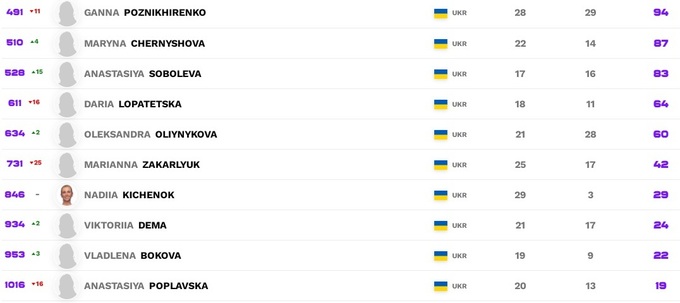 Серед українок продовжує показувати найкращі результати Даяна Ястремська, Ангеліна Калініна вже друга. Перші очки в одиночний рейтинг цього сезону заробили сестри Кіченок.