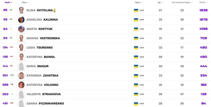Щодо українок, то конкурентки Еліни Світоліної втратили очки, що дозволило їй трохи покращити становище. Ангеліна Калініна встановила чергове особисте досягнення, піднявшись на 36-те місце у рейтингу. До топ-100 повернулася Даяна Ястремська, потихеньку починає підніматися і Катаріна Завацька, яка пропустила тривалий час.
