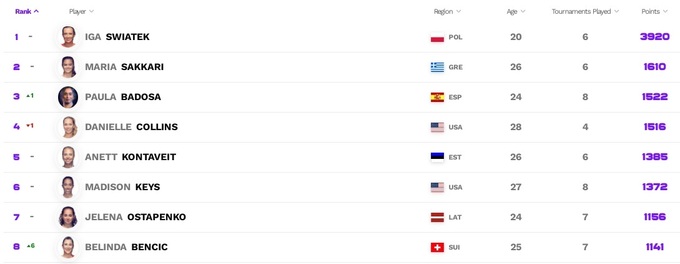 У Чемпіонській гонці до топ-8 увірвалася Бенчич, а Жабер піднялася на 14-й рядок. Інші зміни незначні.