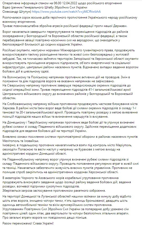 Дані Генштабу: Загальні бойові втрати противника з 24.02 до 12.04 орієнтовно склали:
