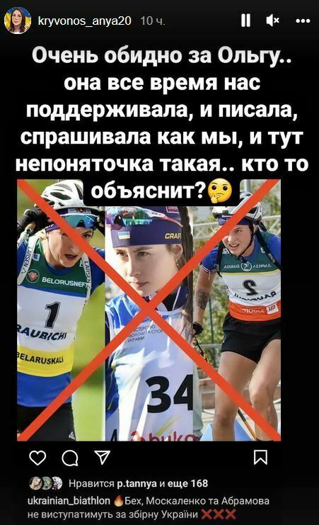 Українська біатлоністка Анна Кривонос висловила розчарування тим, що натуралізовану росіянку Ольгу Абрамову виключили зі складу збірної України.